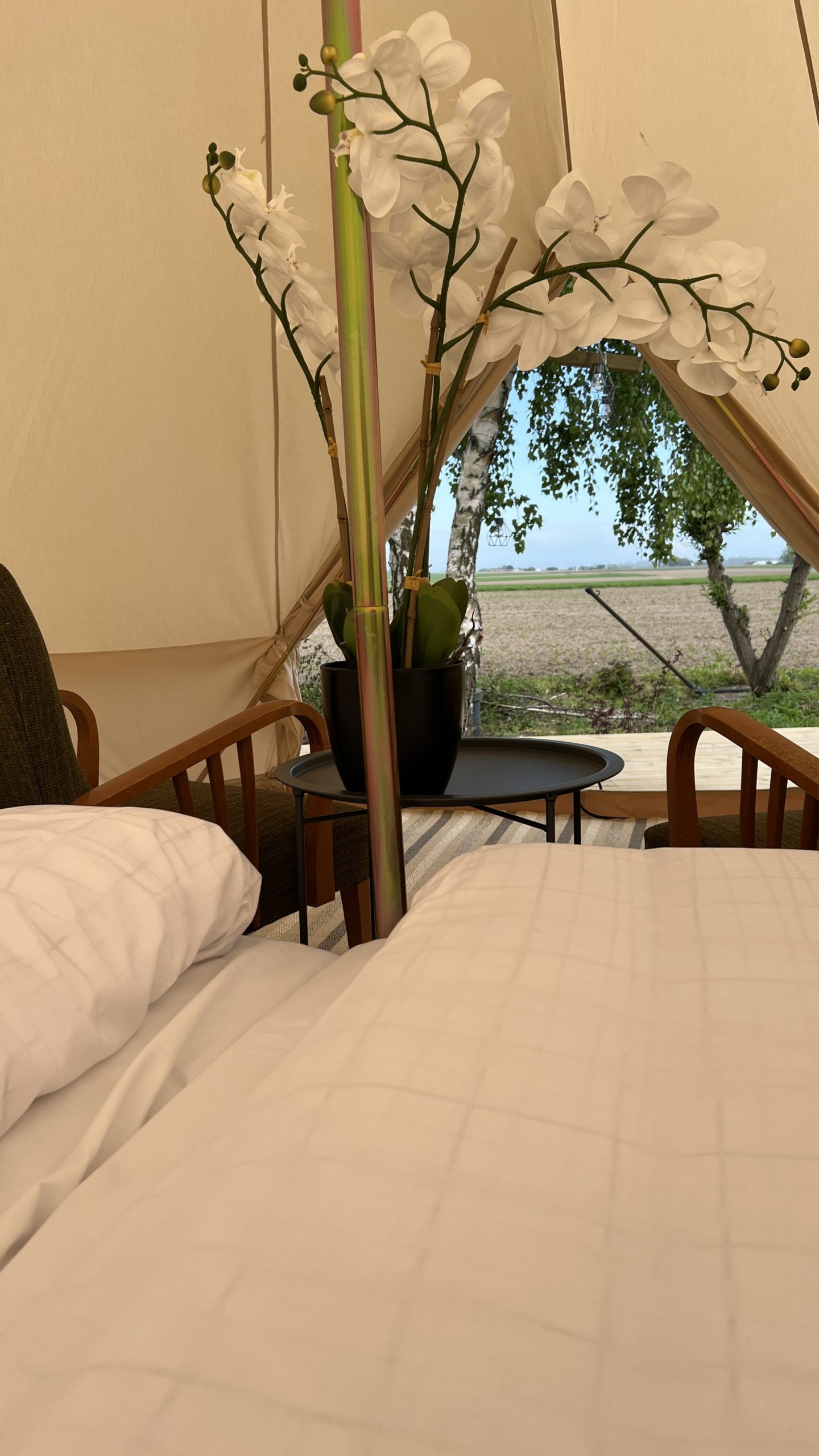 Peppinge glamping på Österlen erbjuder ett härligt glampingtält med riktiga sängar. Lakan och handdukar ingår. Man får även en riktig hotellfrukost med mycket hembakat och hemlagat.