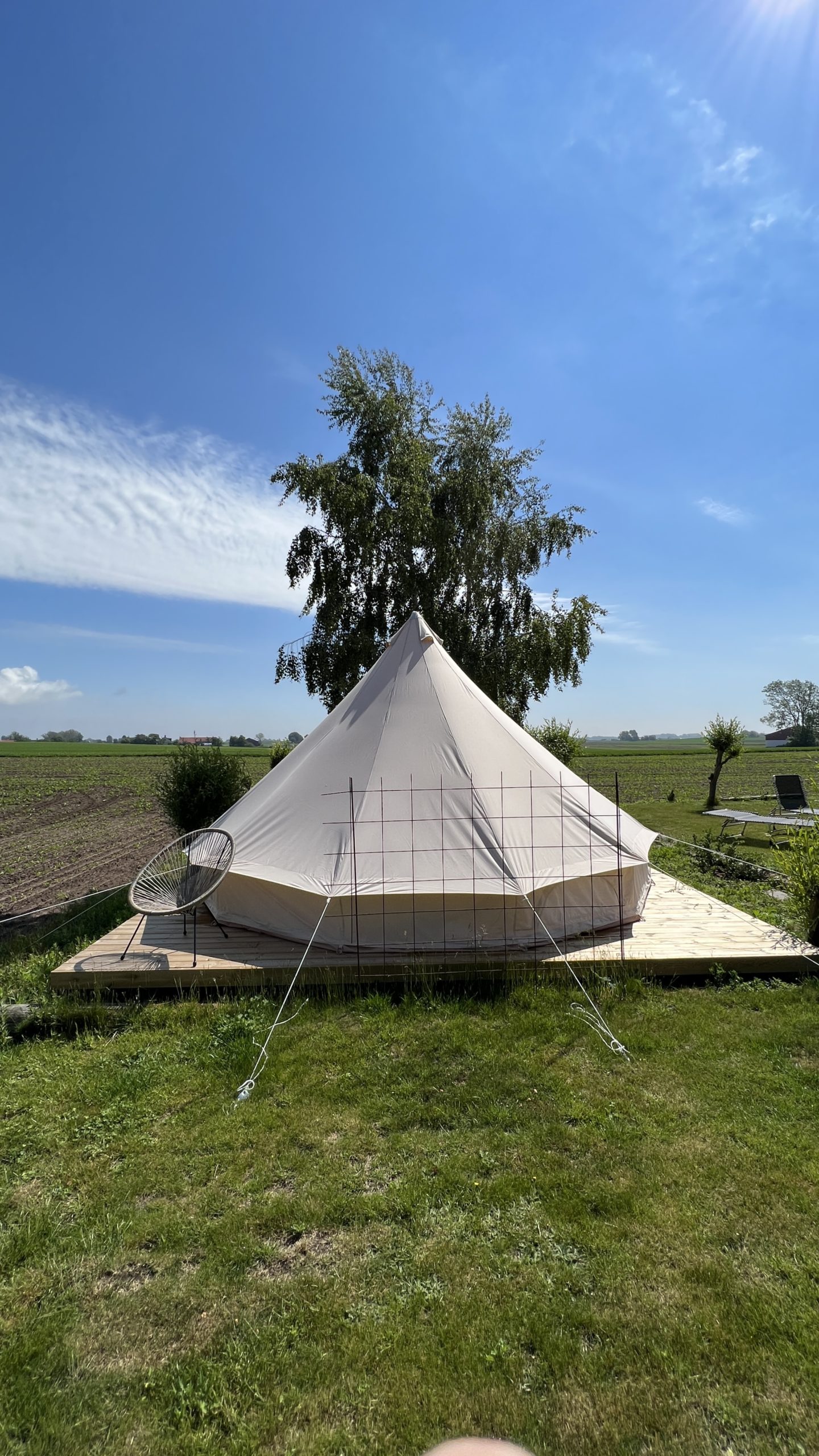 Tältet ligger lite avskilt på tomten med storlagen utsikt över fälten. Tältets storlek är fem meter i diameter. På samma sätt som våra övriga gäster på B&B har man tillgång till många mysiga sittplatser i hela trädgården. Finns toalett som delas med eventuella husbilsgäster. Tillgång till frukostrummet där det finns mikrovågsugn och möjlighet till beredning av lättare måltider. Gasgrill och en Murrikka-häll finns också att låna, gemensam för alla gäster.